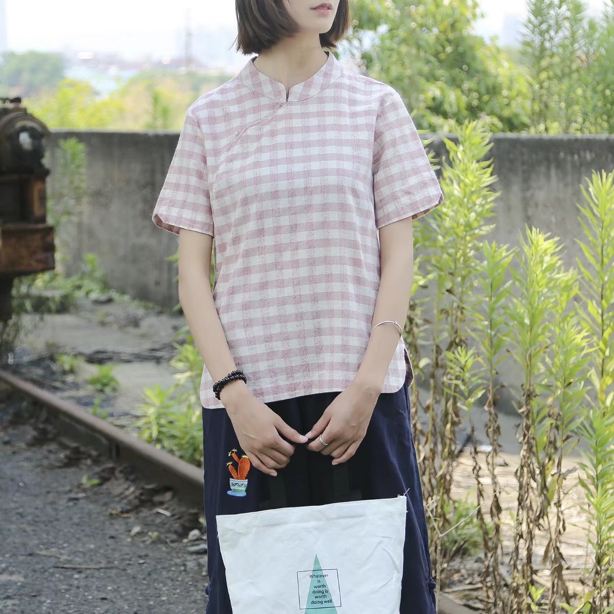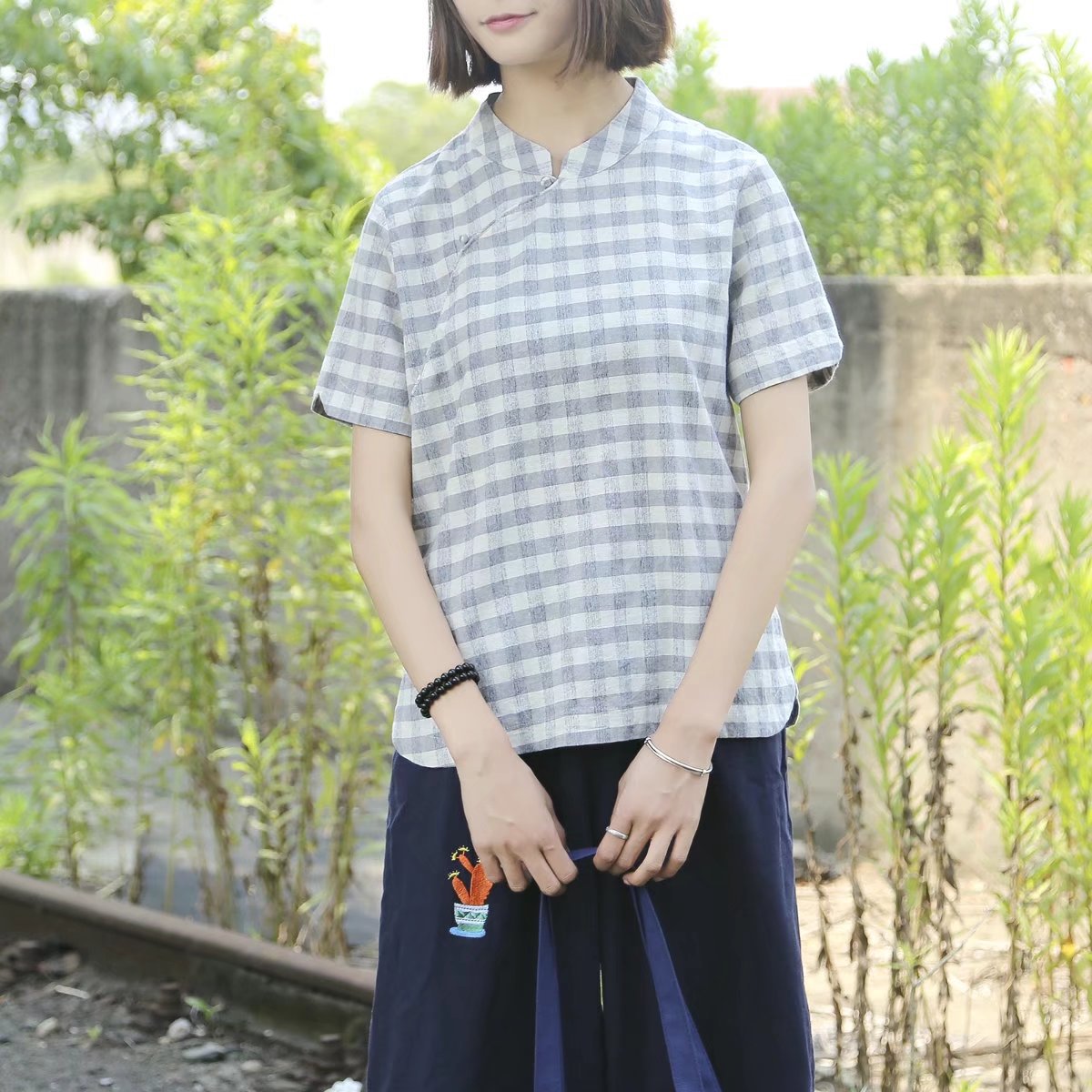 Sommer neue japanische Retro-Literatur und Kunst Fan Stehkragen schräge Knopfleiste Schnalle kariertes Kurzarmhemd Damen