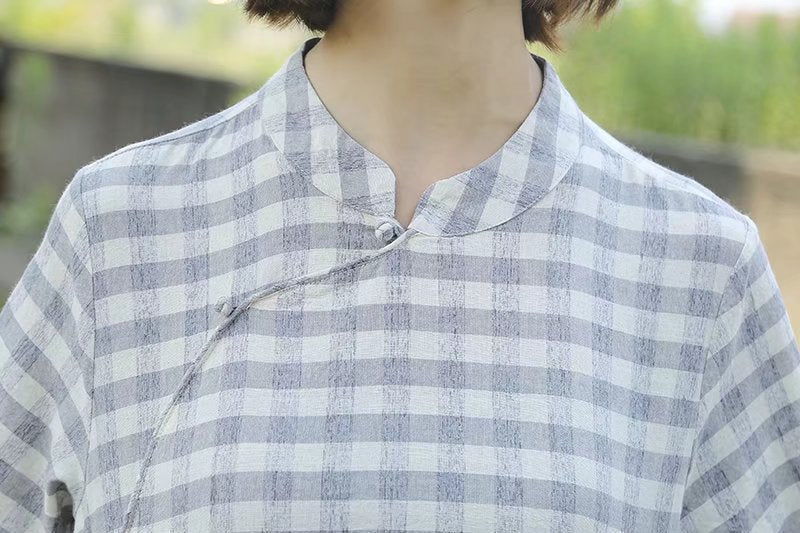 Japanisches Retro-Hemd, karierte Sommerbluse, Damen-Stehkragenhemd, japanische Vintage-Mode, atmungsaktives Baumwollhemd, künstlerische Damenbekleidung, Bluse mit schräger Knopfleiste, Oberteil im japanischen Stil, kurzärmeliges Retro-Hemd, minimalistische Mode für Damen