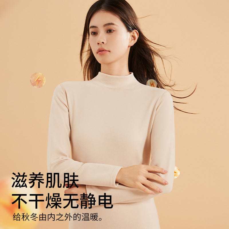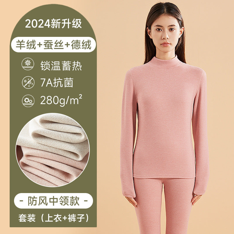 7A Antibacterial Mid Neck Thermal Underwear Set Men's Cashmere Silk Autumn Clothes Autumn Pants Women's Round Neck Velvet Thermal Clothing