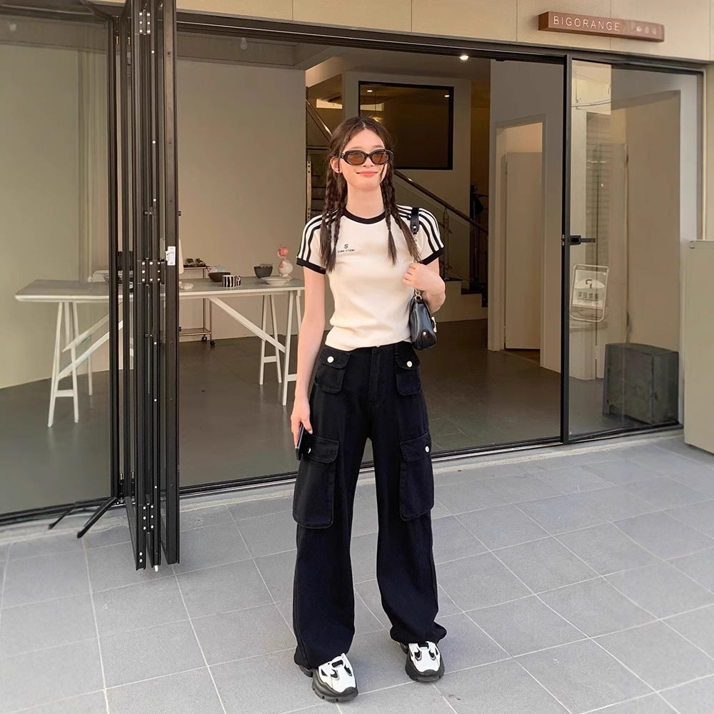 New striped straight shoulder short-sleeved T-shirt women's summer dress design sense hot girl slim slim white shirt crop top girl